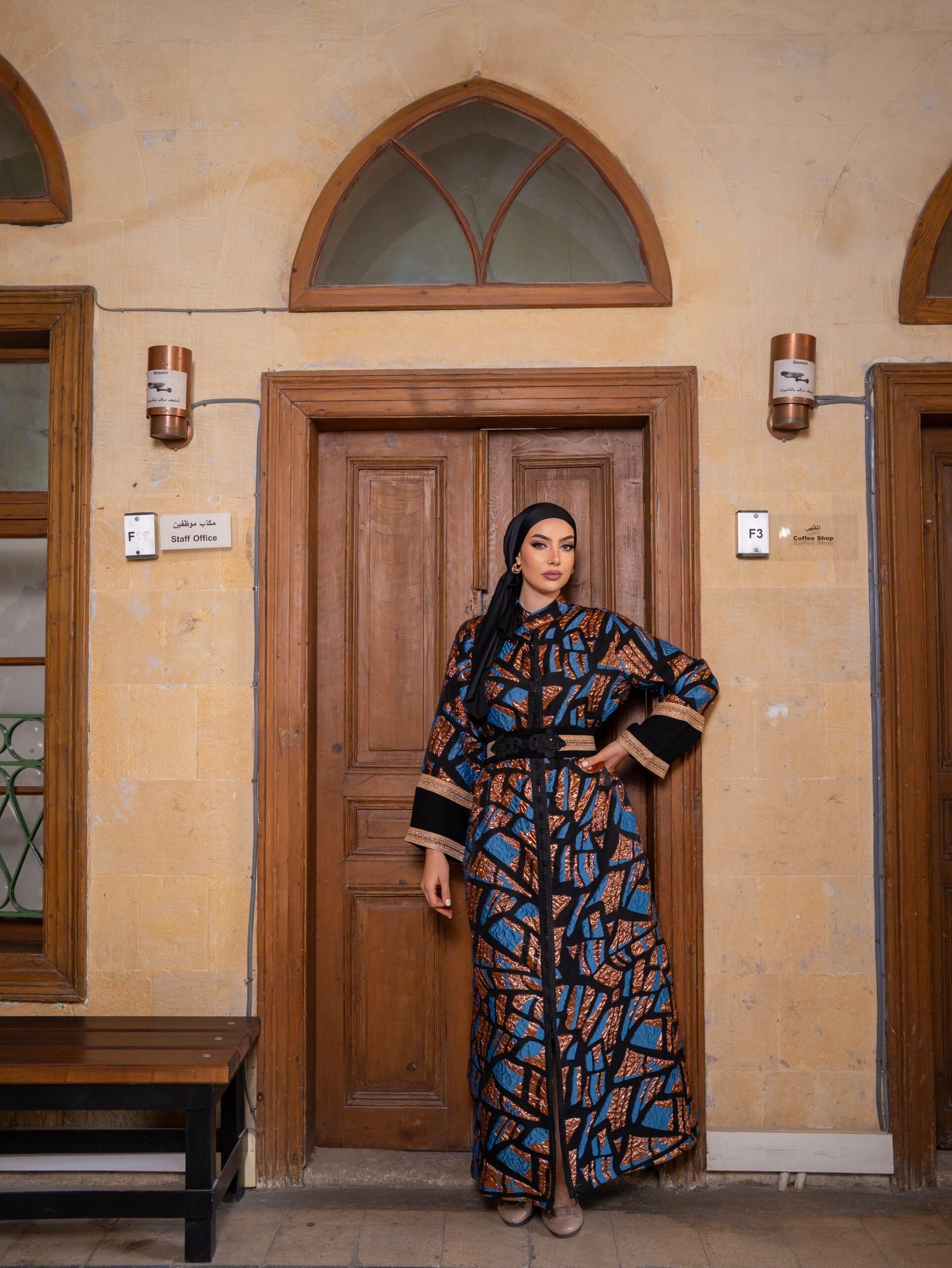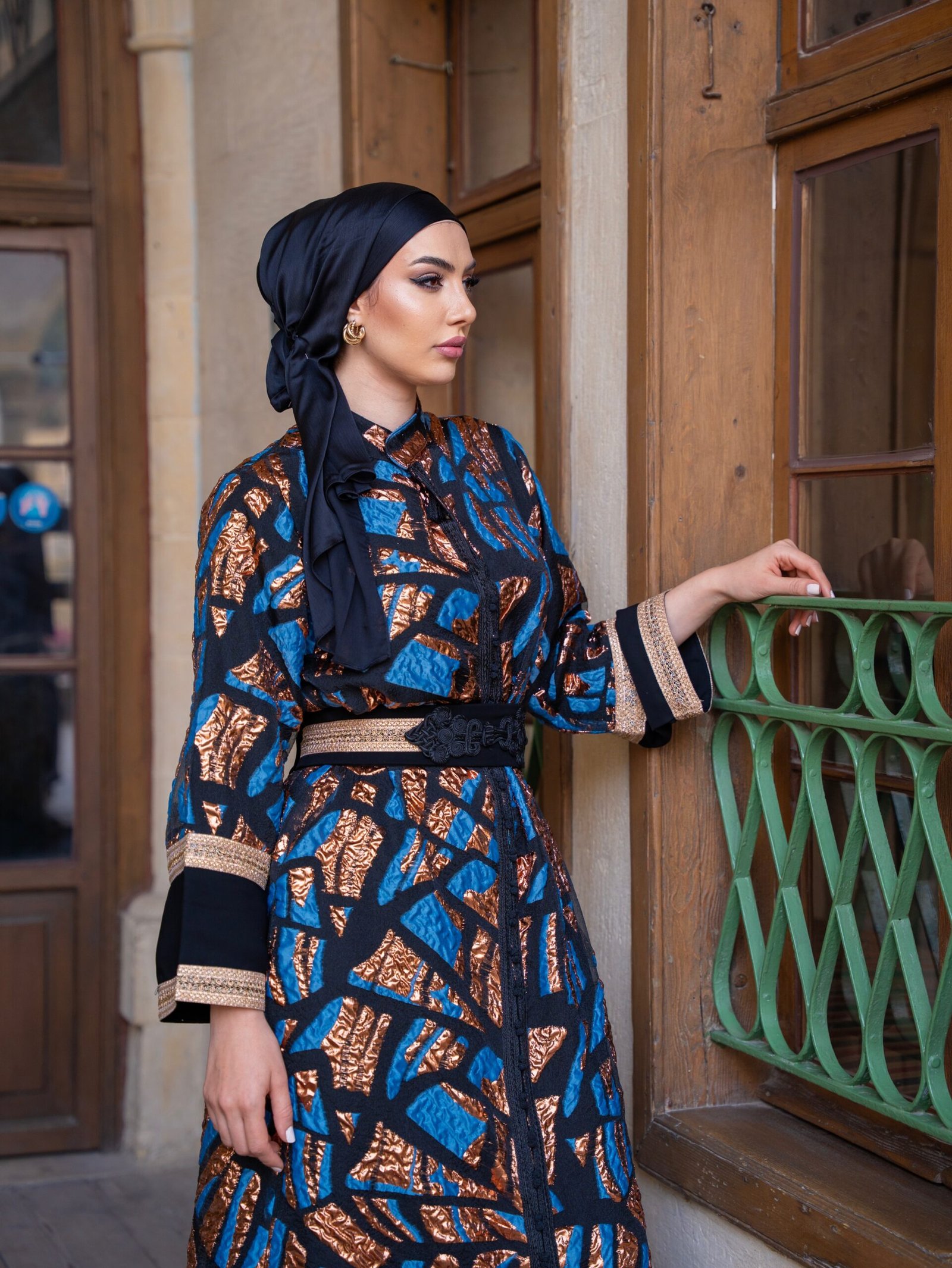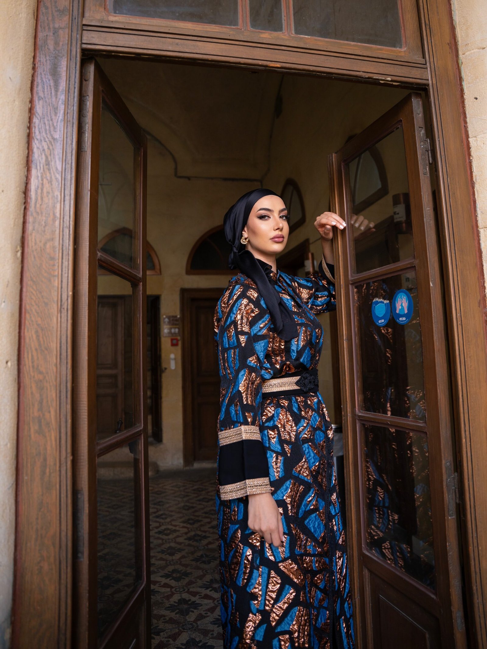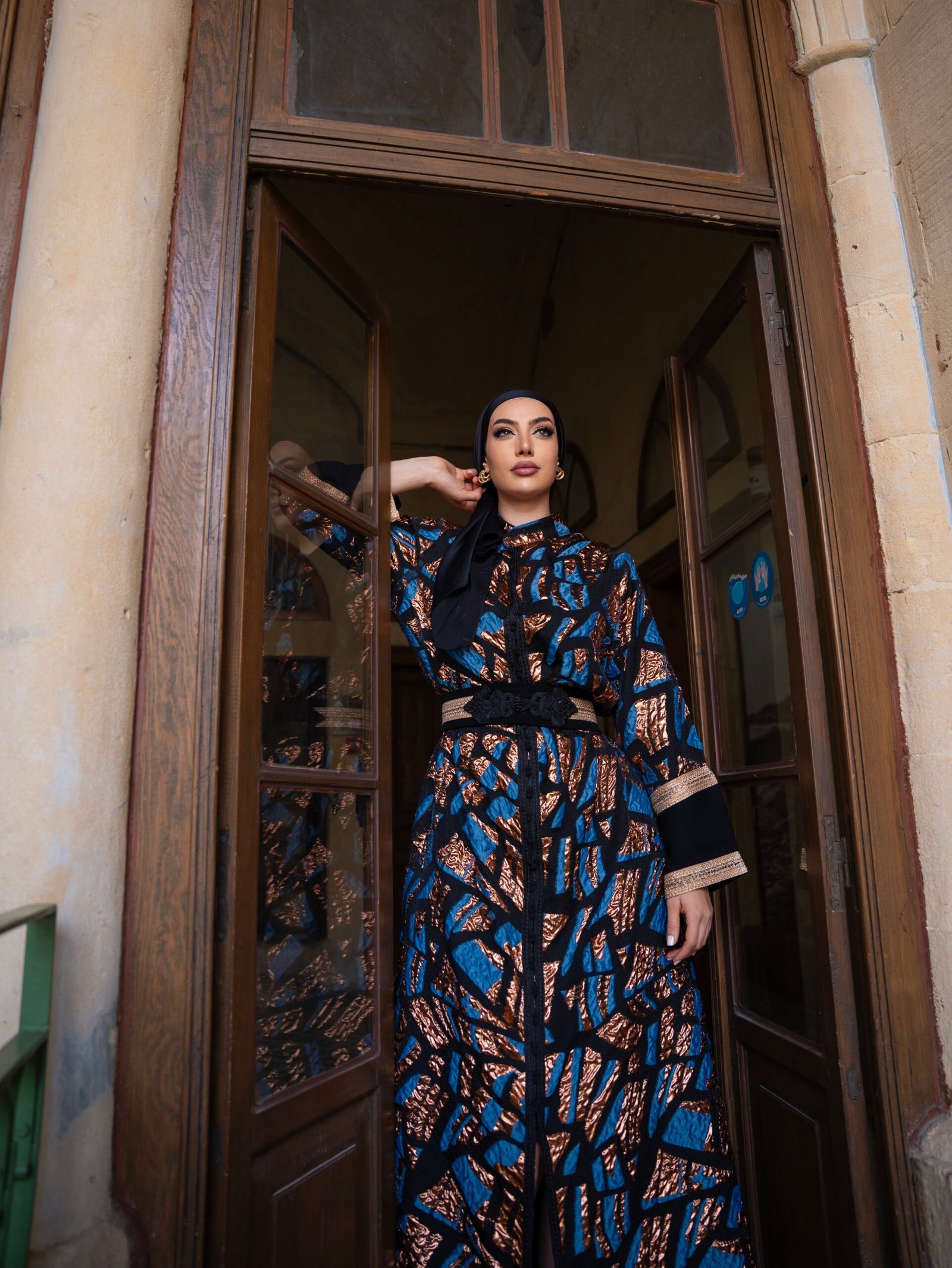 قطعة استثنائية مشغولة بعناية فائقة، تتميز بنقوشها المتكررة التي توحي بالرقي والثبات. الأكمام الواسعة والحزام الأسود المزين بالتطريز اليدوي يضفيان لمسة ملكية تجعلكِ محط الأنظار في كل محفل. قطعة واحدة وحصرية لضمان تميزك.