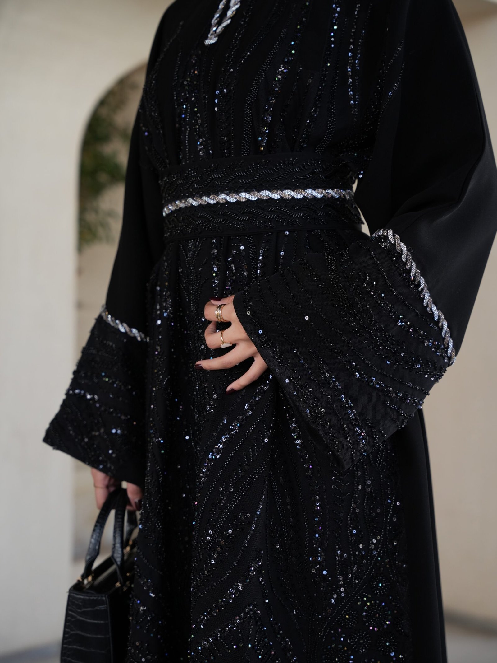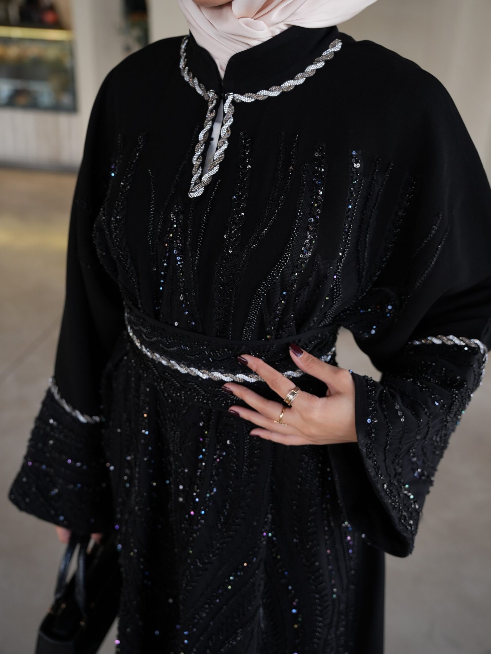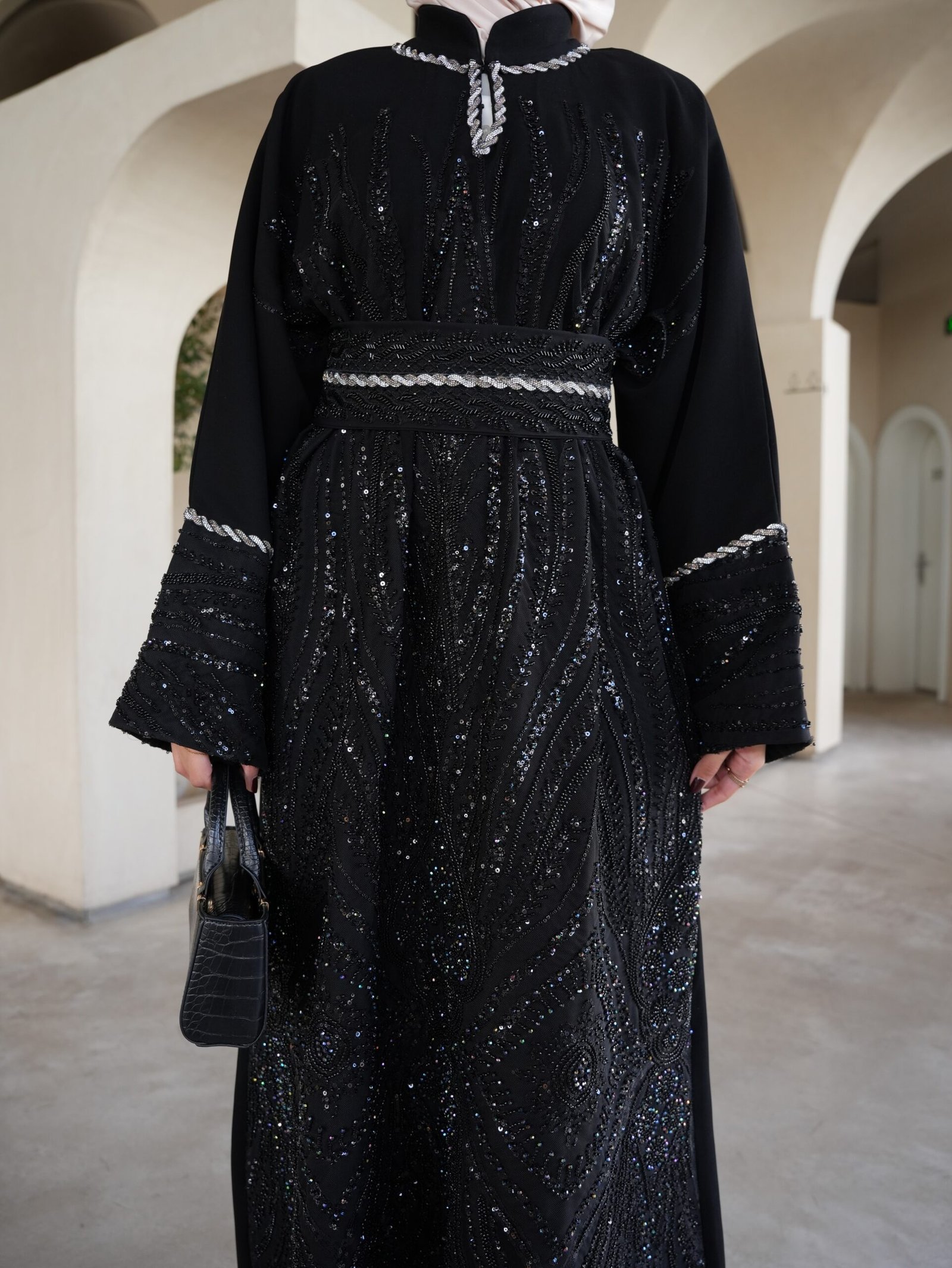 بتوقيع مصممتنا الأردنية أمل عيسي، صممنا لكِ هذا القفطان الأسود الملكي المشغول بدقة متناهية. يتميز بتطريزات يدوية لامعة تبرز جمال التصميم، مع حزام يحدد الخصر ليعطيكِ إطلالة كلاسيكية فاخرة تناسب أرقى سهراتك
