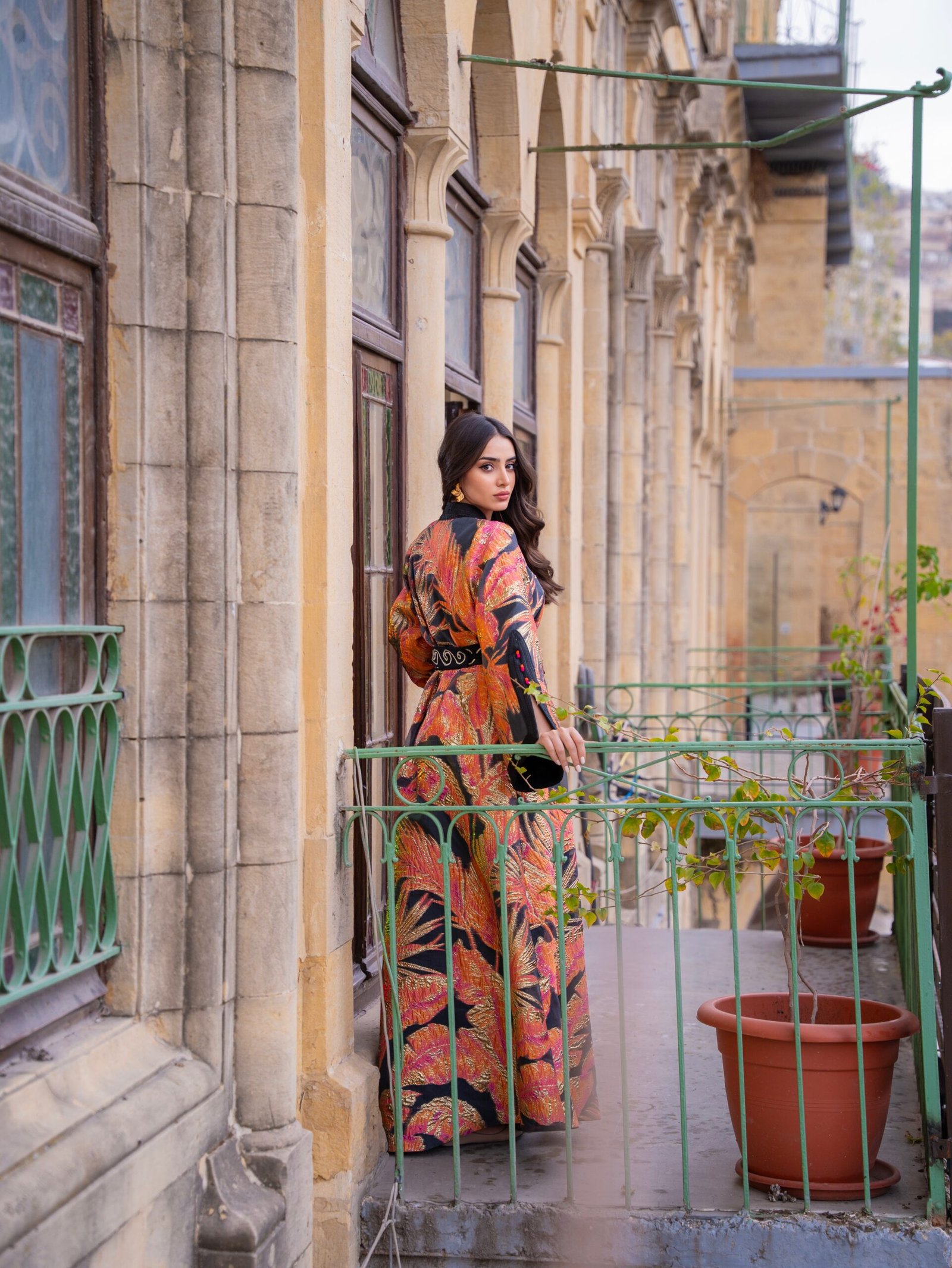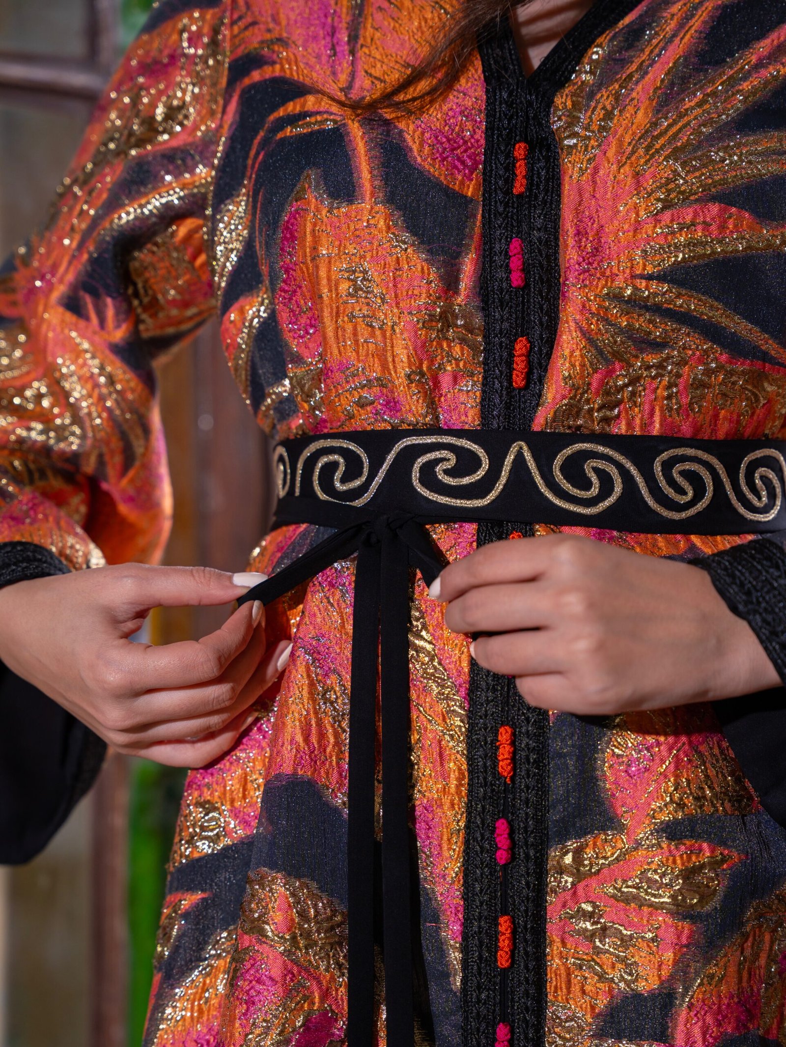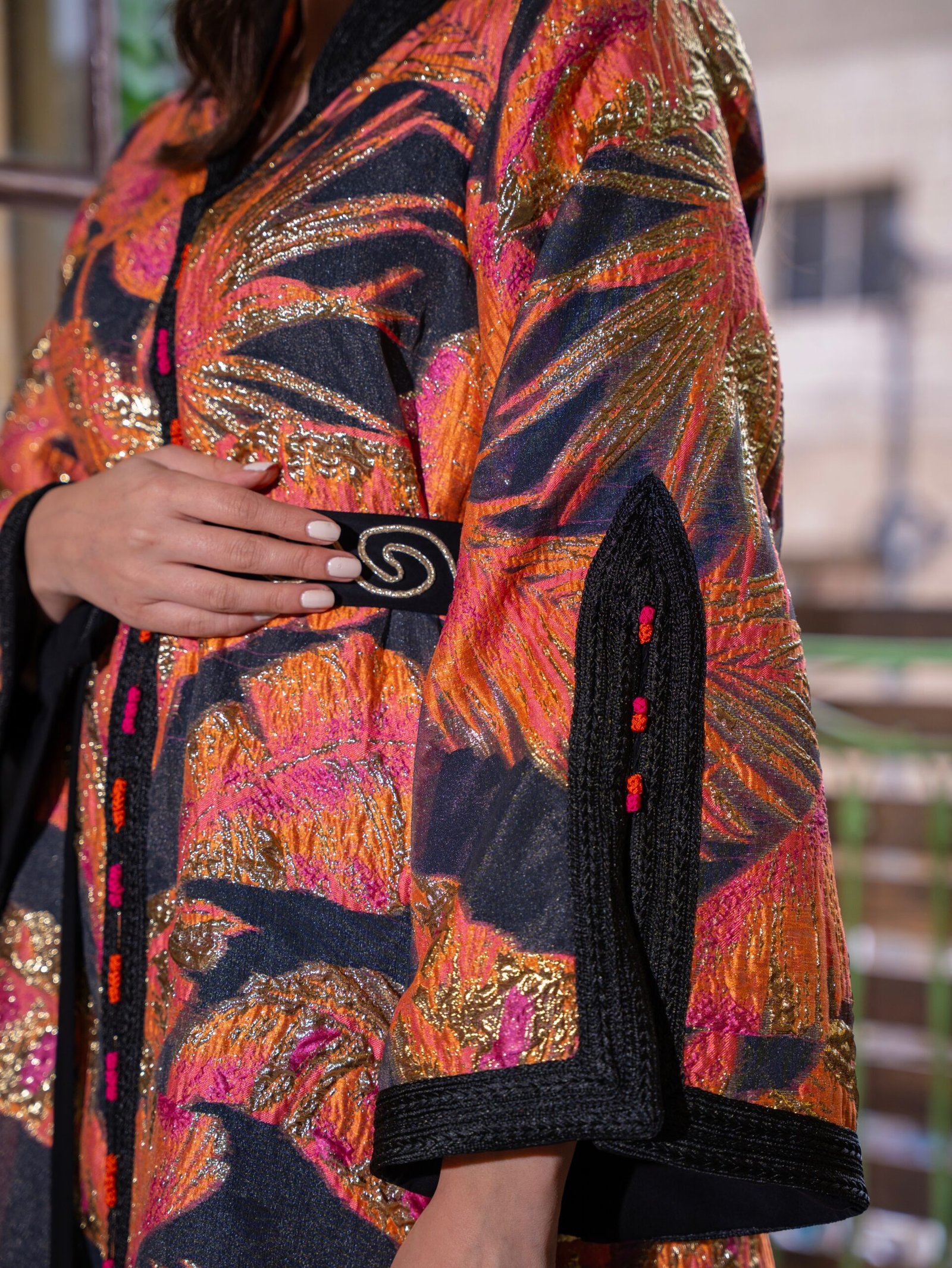 بتوقيع أردني مبدع، نقدم لكِ هذا القفطان المكون من فستان داخلي ناعم بلون اللافندر، وفوقه طبقة خارجية من البروكار الخفيف المزدان بنقوش فضية ساحرة. الأكمام المزينة بـ “العقاد” التقليدية والحزام المتناغم يضفيان لمسة تراثية بروح حديثة. كوني الوحيدة التي تتألق بهذا التصميم، حيث لا توجد منه إلا قطعة واحدة فقط