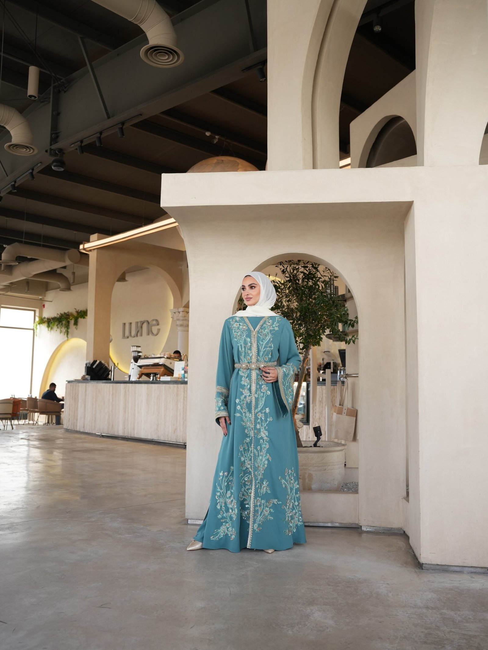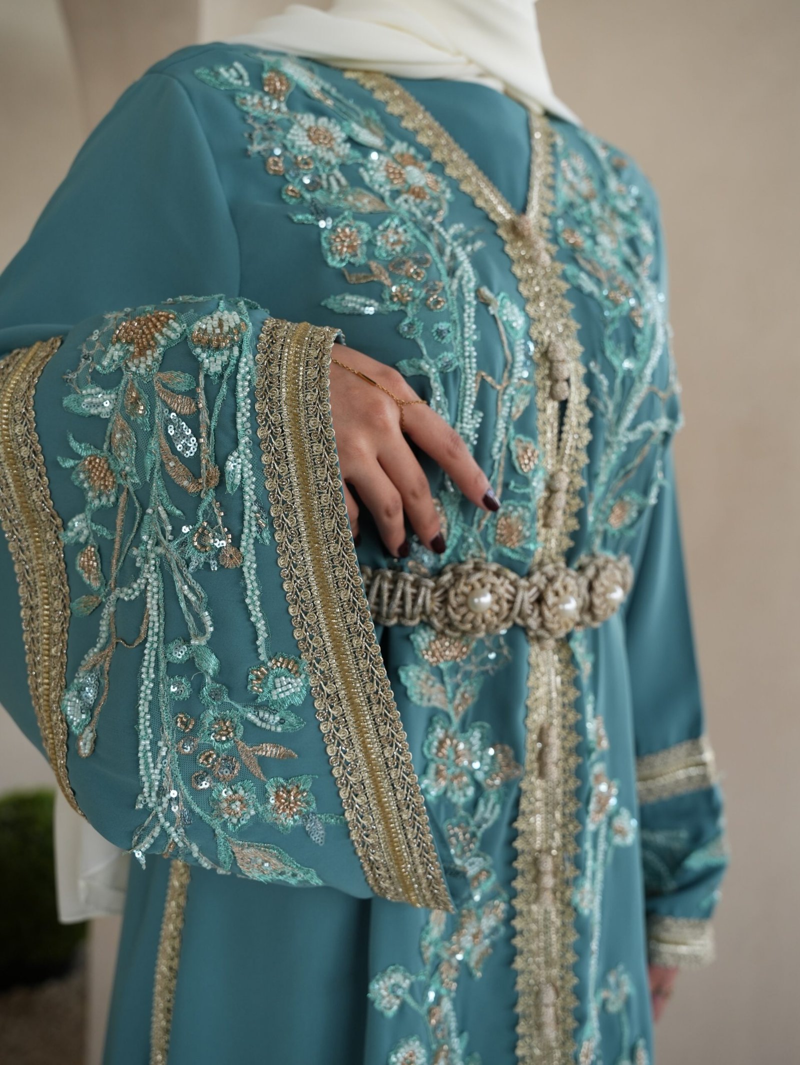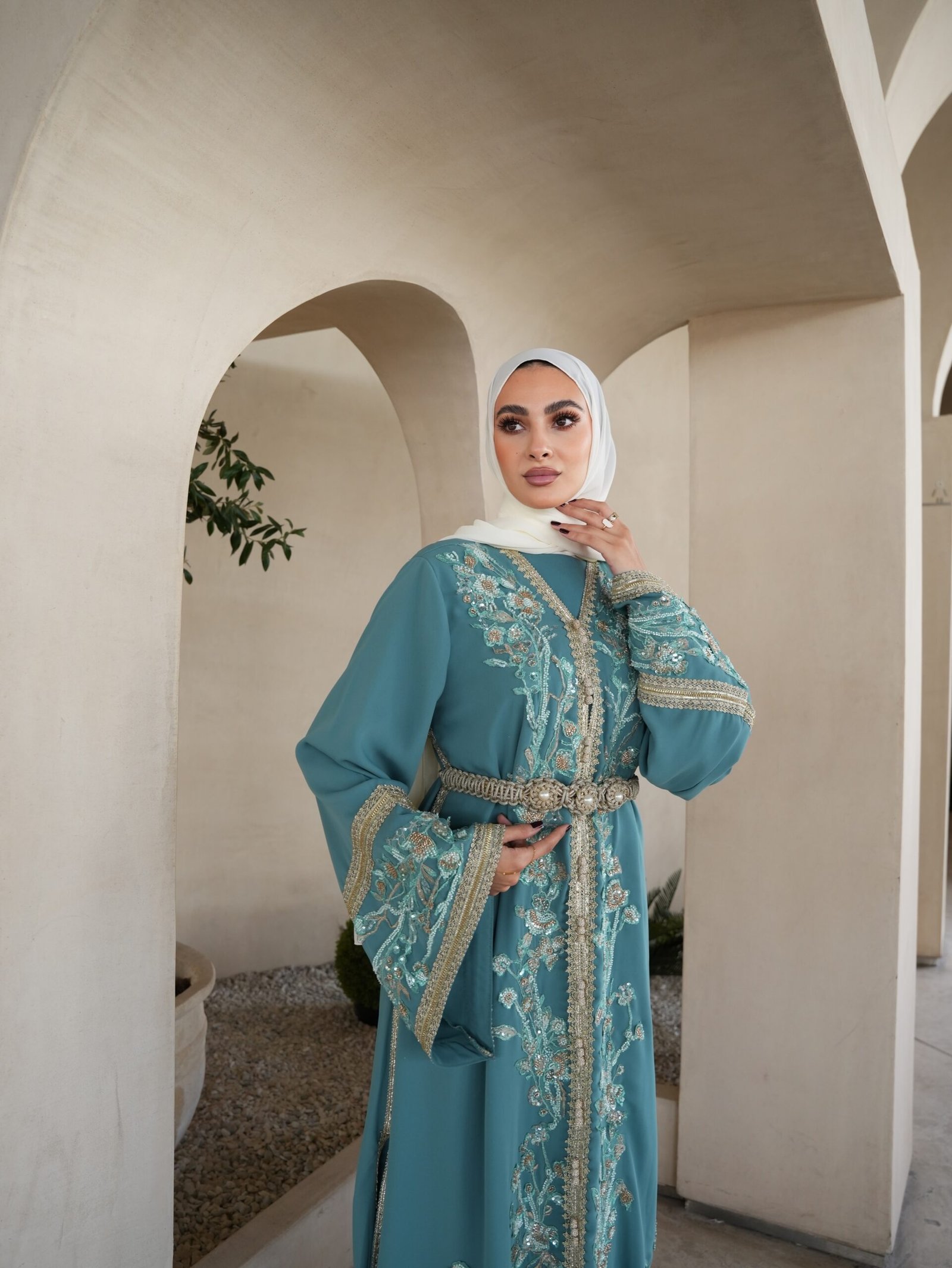 بأنامل مصممتنا الأردنية المبدعة أمل عيسي، نقدم لكِ هذا القفطان الذي يجمع بين سحر التراث المغربي الأصيل ولمسات الأناقة العصرية. الموديل مصمم بذكاء من قطعتين: فستان داخلي ناعم يمنحكِ الراحة، وفوقه طبقة خارجية مطرزة بدقة وفن تفيض بالرقي.