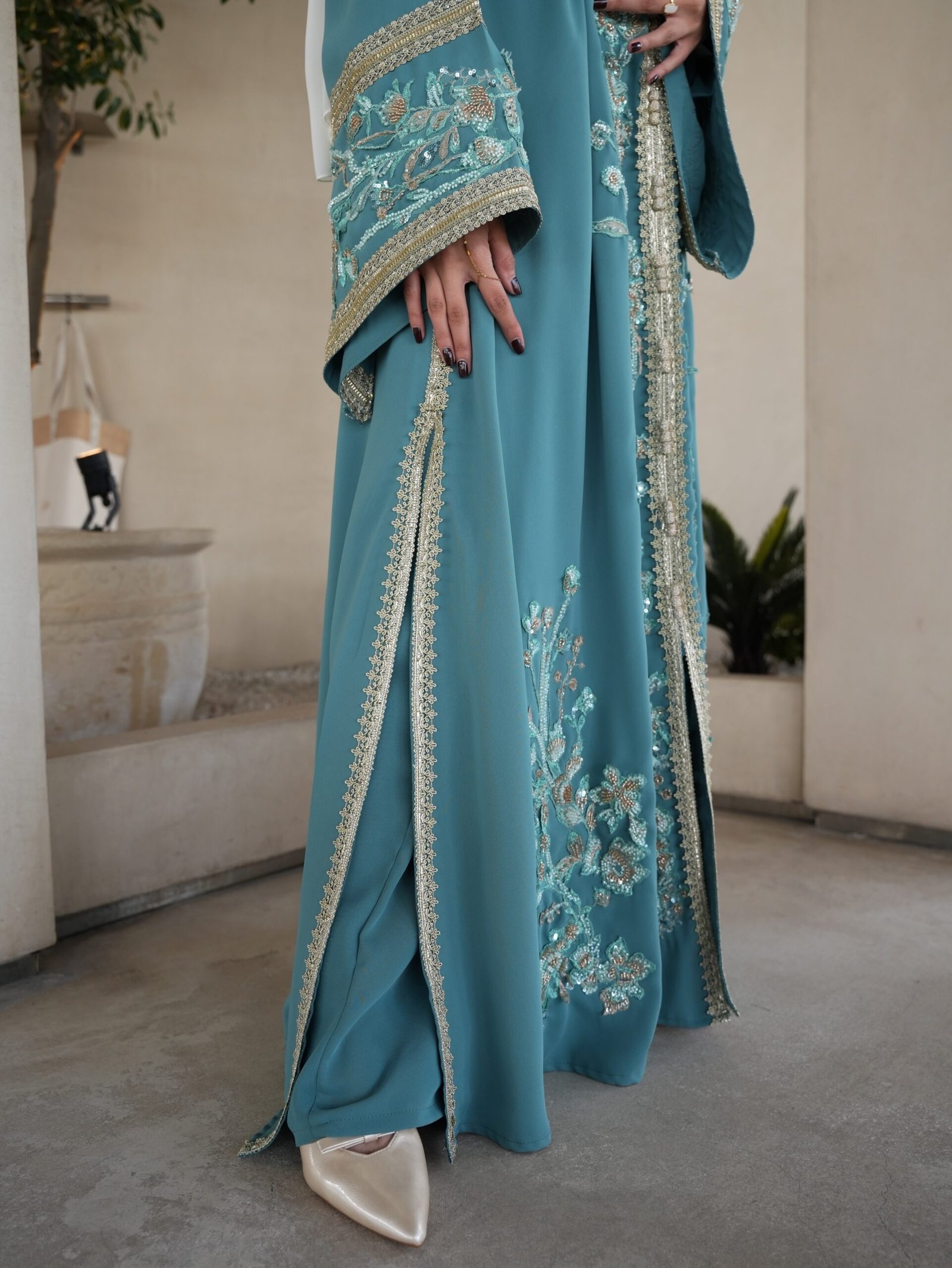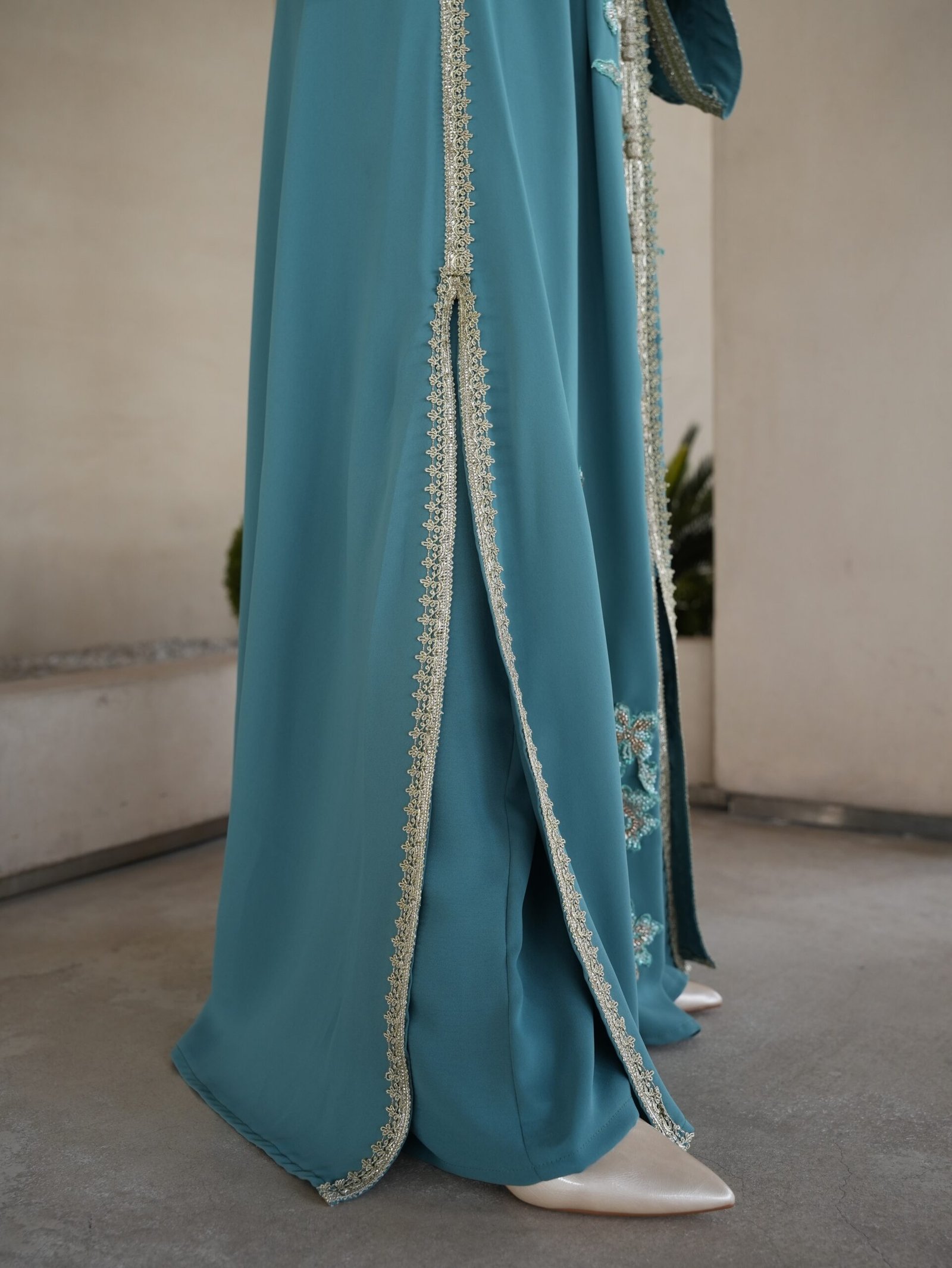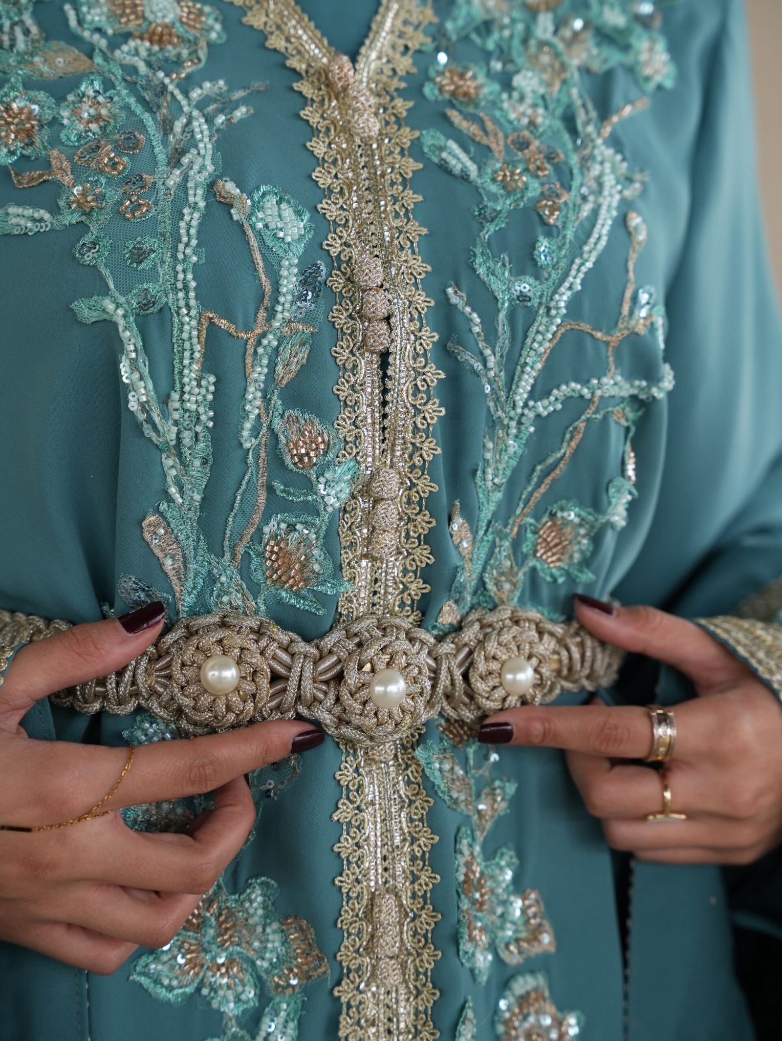 بأنامل مصممتنا الأردنية المبدعة أمل عيسي، نقدم لكِ هذا القفطان الذي يجمع بين سحر التراث المغربي الأصيل ولمسات الأناقة العصرية. الموديل مصمم بذكاء من قطعتين: فستان داخلي ناعم يمنحكِ الراحة، وفوقه طبقة خارجية مطرزة بدقة وفن تفيض بالرقي.