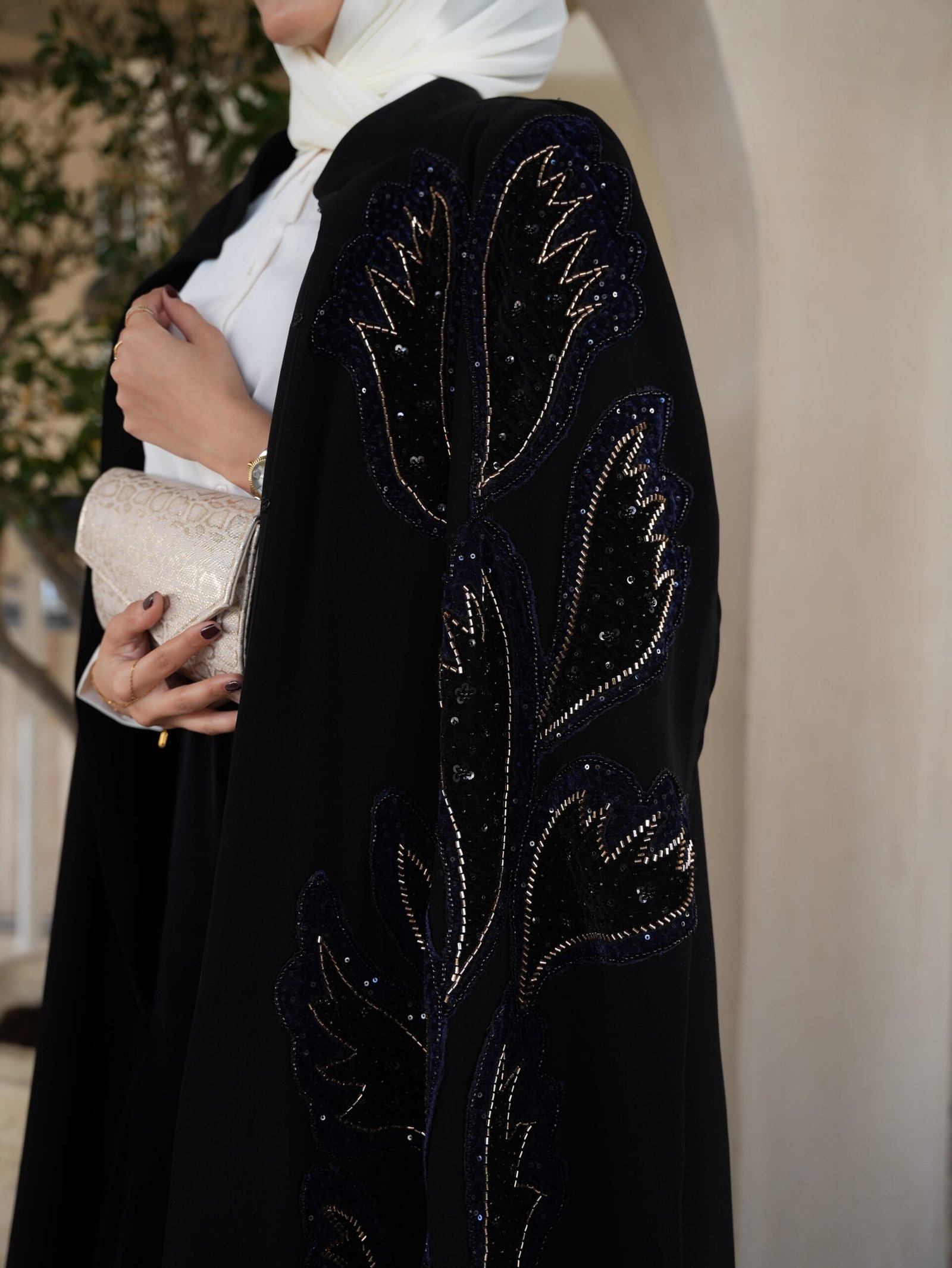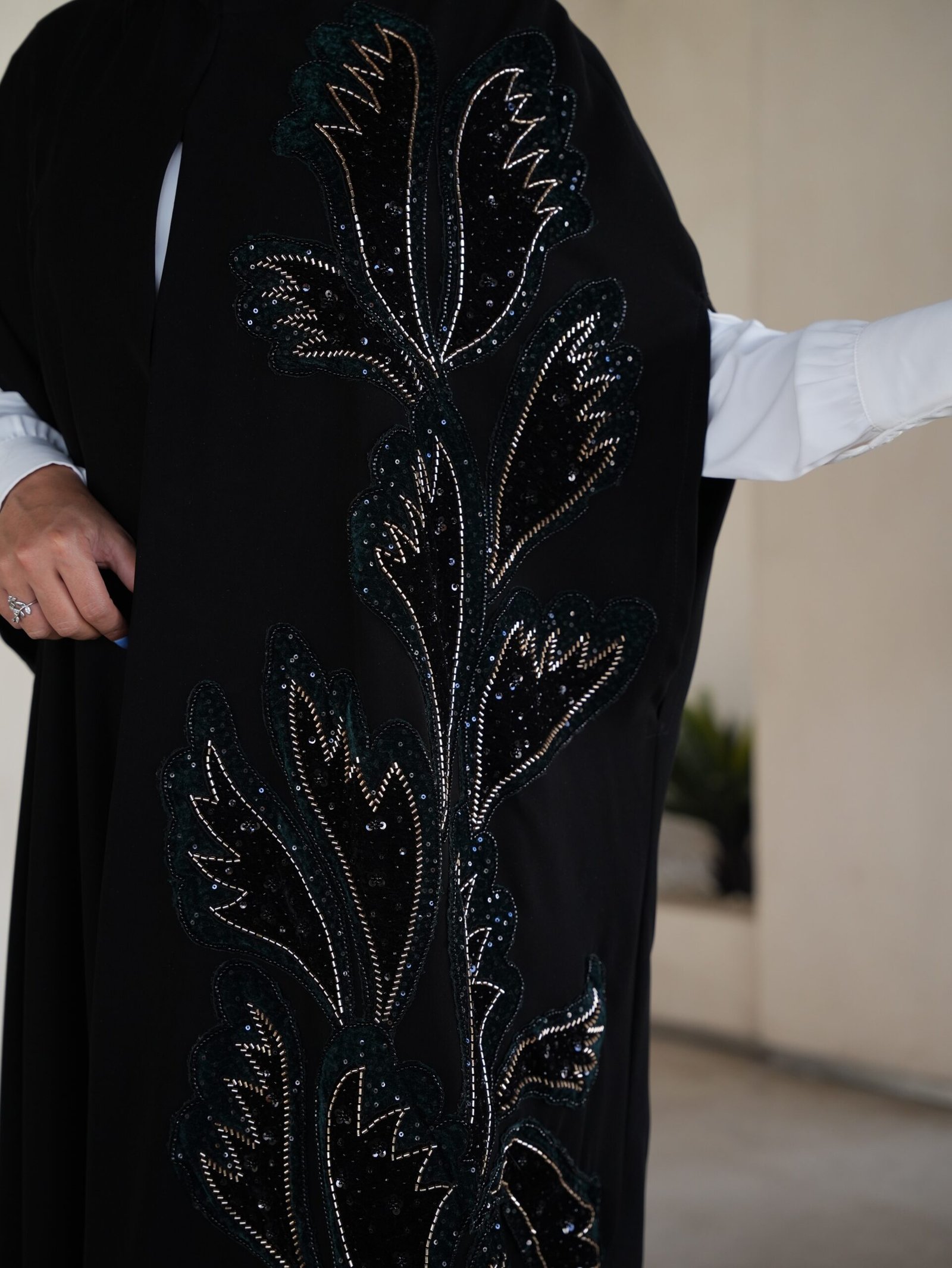 من إبداع أنامل أردنية، صُمم هذا القفطان الأسود الفاخر ليكون عنواناً للأناقة في مناسباتك الكبرى. يتميز بنقوشه الانسيابية التي تزين جانب القطعة بتطريزات دقيقة تلمع مع كل حركة. ولأن التميز لا يتكرر، وفرنا منه “قطعة واحدة فقط” تضمن لكِ حضوراً فريداً يجمع بين كلاسيكية اللون وعصرية التصميم.
